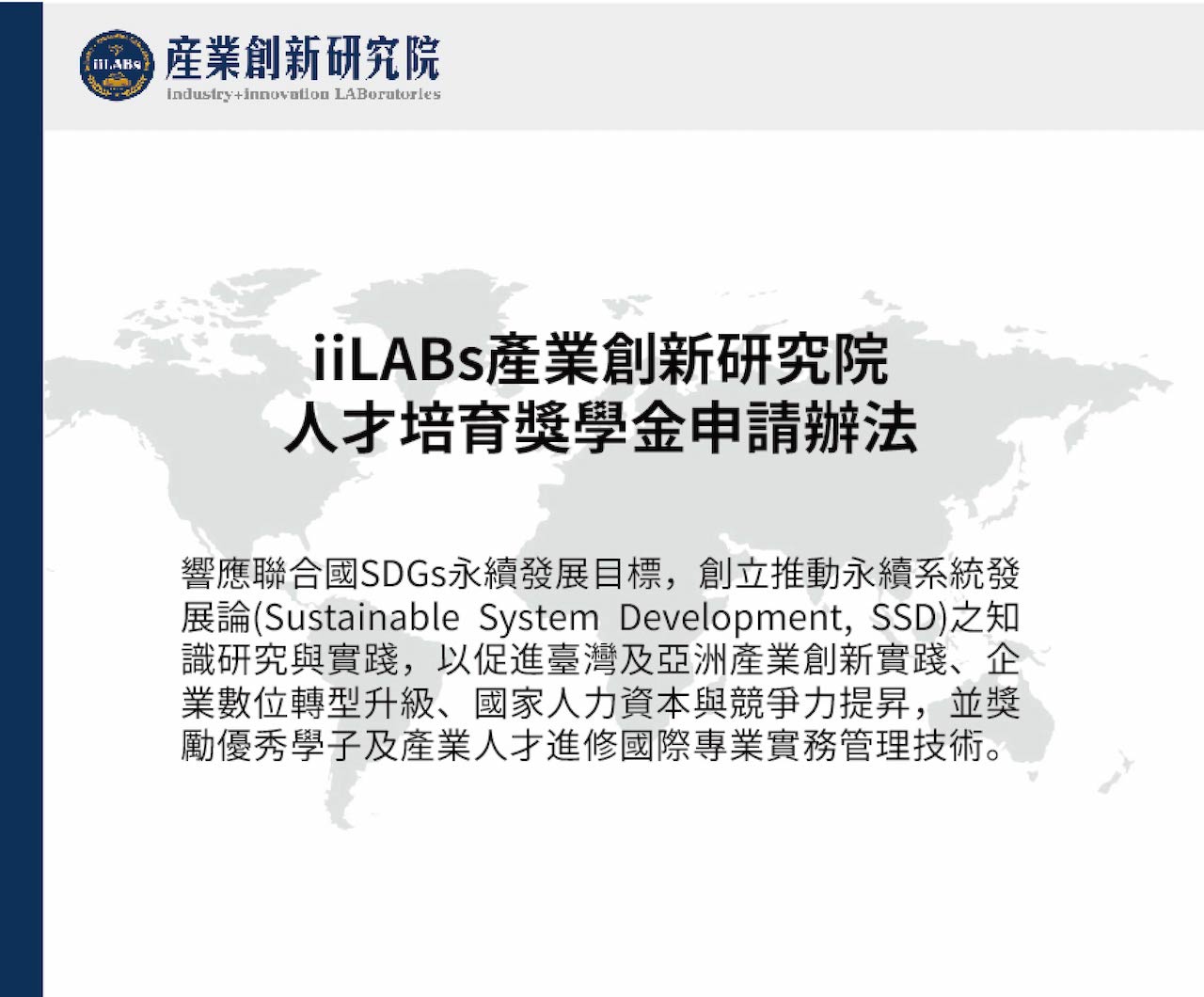 創立於芝加哥,iiLABs (industry + innovation LABoratories)產業創新研究院係由美國西北大學(Northwestern)、MIT麻省理工學院、康乃爾大學(Cornell)、百森商學院(Babson)、英國倫敦商學院、德國哥廷根大學、歐洲及日韓大學聯盟等國際學者專家成立之學研機構。統合策略動態學(Strategy Dynamics)、管理科學(Management Science)、開放式創新(Open Innovation)、系統領導學(Systems Leadership)、創業實踐教育(Entrepreneurial Thought & Action)等國際專業及知名權威領域專家,響應聯合國SDGs永續發展目標,創立推動永續系統發展論(Sustainable System Development, SSD)之知識研究與實踐,以促進臺灣及亞洲產業創新實踐、企業數位轉型升級、國家人力資本與競爭力提昇。